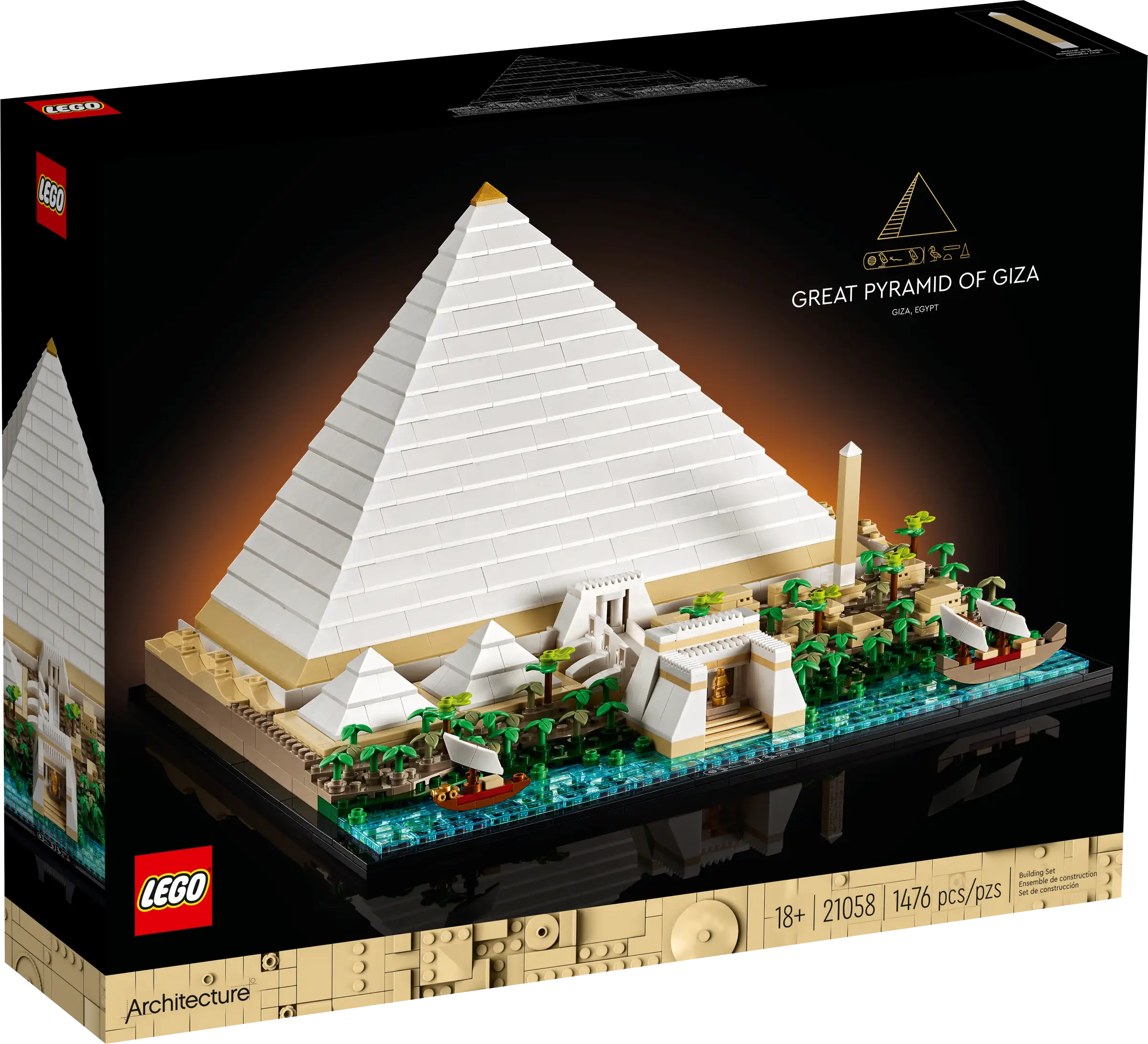 Take an imaginative leap back in time to the 26th century BC and experience the building of one of the Seven Wonders of the Ancient World with this LEGO® Architecture Great Pyramid of Giza model (21058). Build a beautifully detailed cross-section model of the Great Pyramid, revealing its main tunnels and chambers and the system that may have been used to move huge stones during its construction. Visualise how this area by the River Nile is thought to have looked in ancient times, with 2 small pyramids, 2 mortuary temples, Sphinx statues, an obelisk and more.