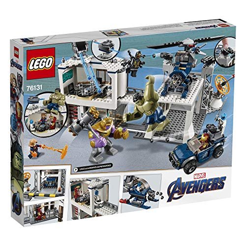 Details: Kids can stage a thrilling LEGO® Marvel 76131 Avengers Compound Battle and defeat Thanos and the Outrider! The Avengers HQ building set features a 2-level office building with a meeting room—including a table with a secret gun compartment and opening ‘laser-beam’ safe. A helipad, garage, rooftop spring-loaded shooter and dual stud shooters are also included to create the perfect action toy. Plus a rotating, tilting radar for pretend play with Avenger Characters such as an Iron Man Minifigure. This cool Avengers set for kids also includes a toy helicopter with adjustable, spinning rotors and 6-stud rapid shooter, and an offroader toy car with a rotating turret with dual stud shooter. Play out thrilling scenes from the Marvel Avengers movies with 4 Avengers minifigures, an Ant-Man microfigure and posable Hulk and Thanos big figures.
