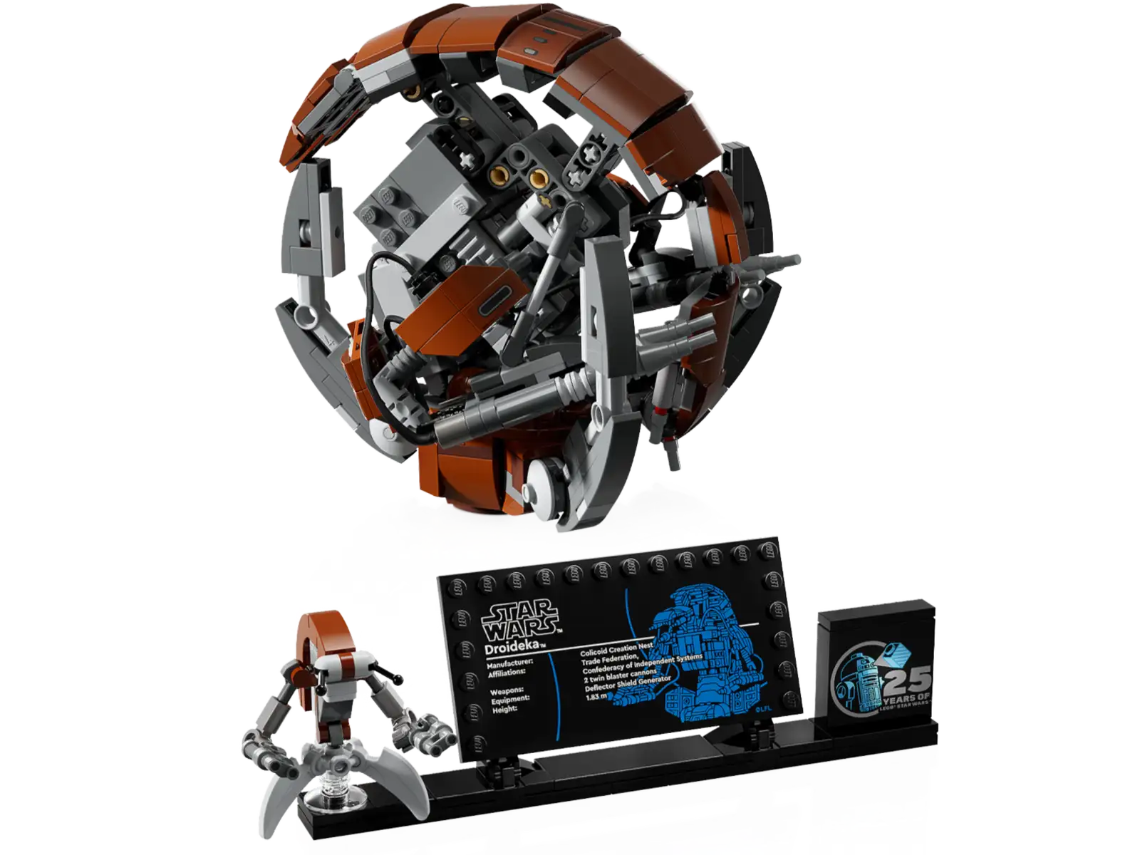 - 25th anniversary centerpiece – This unique set includes a stand with space for the small LEGO® droid figure of a Droideka, a Droideka information plaque and a LEGO® Star Wars™ 25th anniversary brick