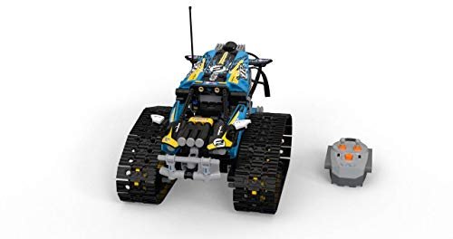 Details: Pull high-speed wheelies, spins and turns, and traverse rough terrain with the LEGO® Technic 42095 Remote-Controlled Stunt Racer—the ultimate motorized vehicle for kids. This tough 2-in-1 model features 2 large ground-gripping tracks with large rear sprockets for optimal acceleration, and a modern design with a fresh yellow and blue color scheme and decorative stickers. Drive forward, backward, left or right and make 360° turns. Rebuild this remote-controlled tracked vehicle to create a Remote-Controlled Racer for a double build-and-play experience.